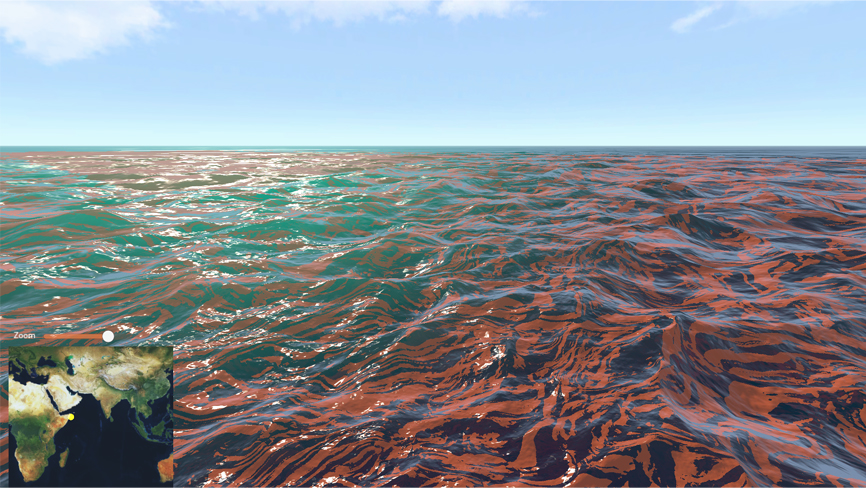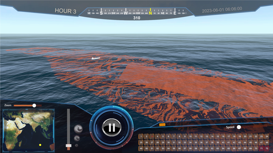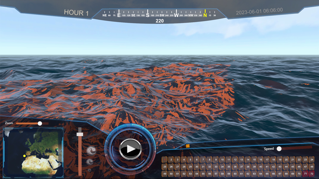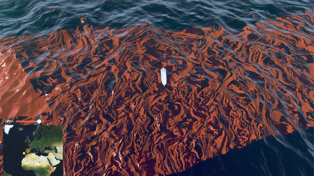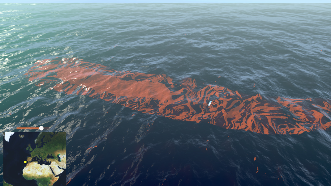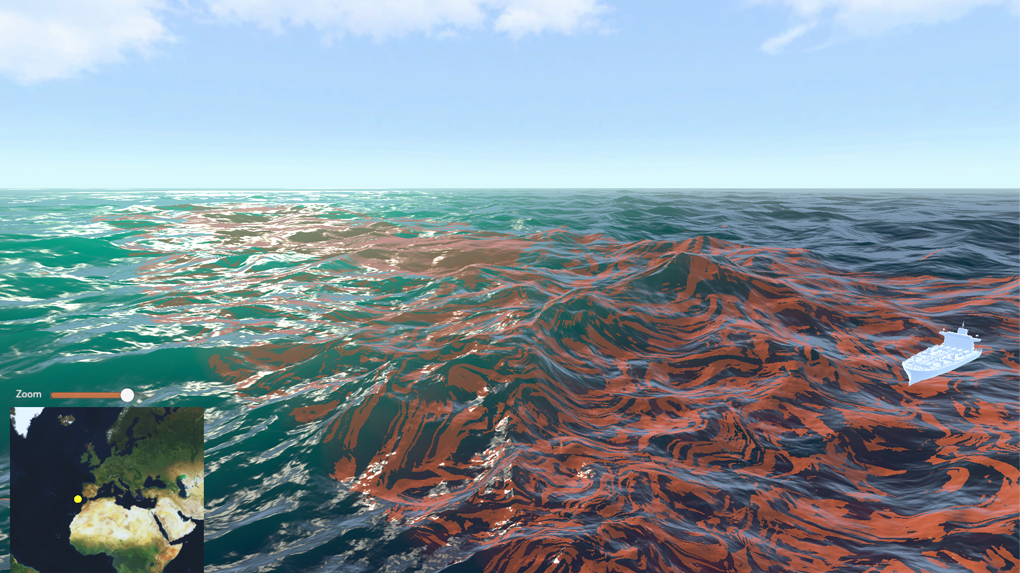 This demonstrator allows immersive visualisation of oil spills that are generated through a data processing workflow. When faced with an oil spill scenario, data is generated that allows what happened to be monitored and thus interactively visualised.